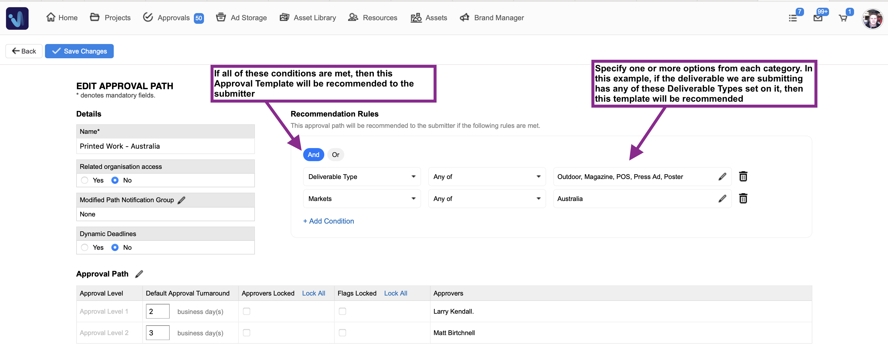 When you submit an asset for approval, Admation automatically analyses the details of your submission—what type of deliverable it is, which campaign it belongs to, which markets it targets, the tags you've applied, and even your department and role within the organisation.